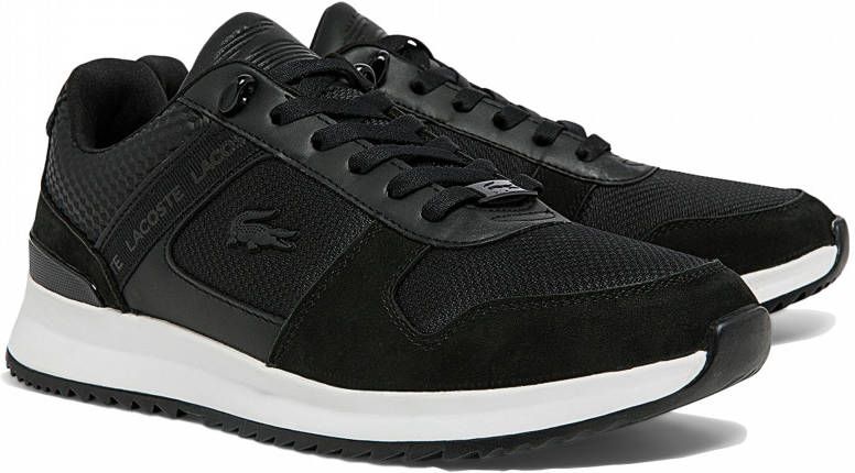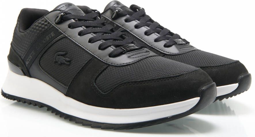 Heren sneakers, model Joggeur 2.0 uitgevoerd in een combinatie zwart leer en high-tech mesh. Op de zijkant van de schoen staat de bekende Lacoste krokodil afgebeeld. Aan de binnenkant is de schoen comfortabel gevoerd en voorzien van een EVA midsole en een uitneembaar voetbed. De witte rubberen loopzool heeft een grof profiel wat zorgt voor een goede grip en een sportieve look. Wees een trendsetter met deze sportieve casual heren sneakers van Lacoste!.
